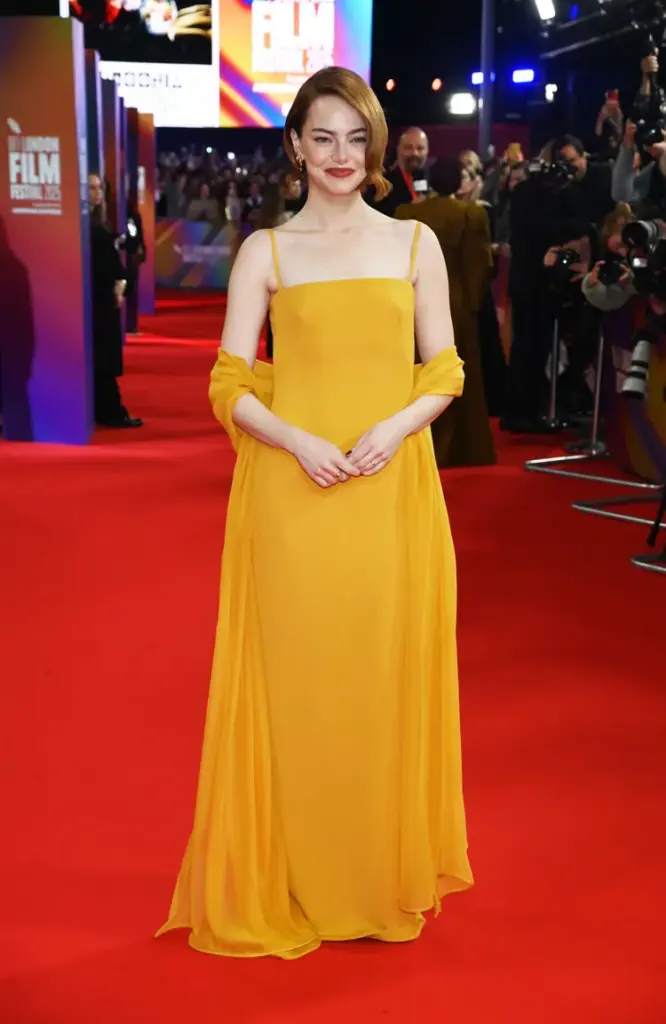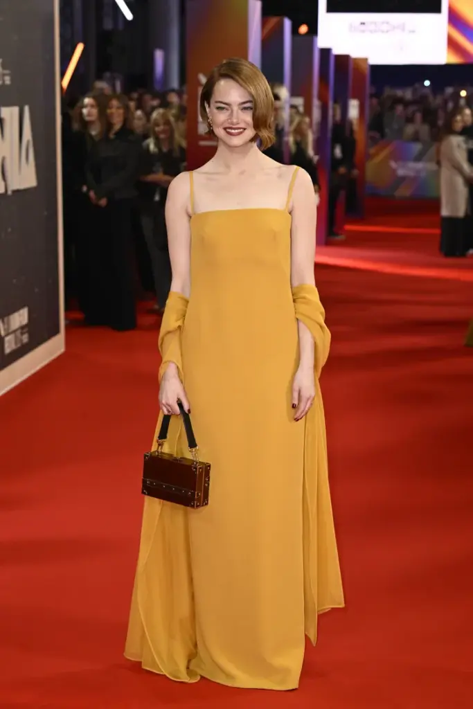 For the premiere, Emma paired her hairstyle with an elegant yet understated look. She wore a mustard-yellow Louis Vuitton slip dress with a square neckline and a column silhouette, styled by Petra Flannery. The dress was complemented with a matching shawl, a square brown handbag, and a bold dark red lip that tied everything together.