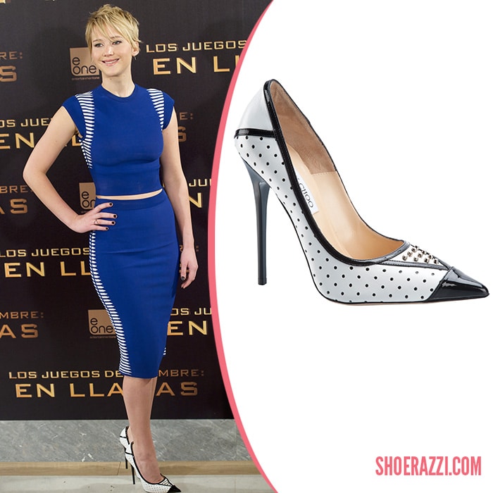 Jennifer Lawrence wore Jimmy Choo Shaken pumps to ‘The Hunger Games: Catching Fire’ Madrid photo call.